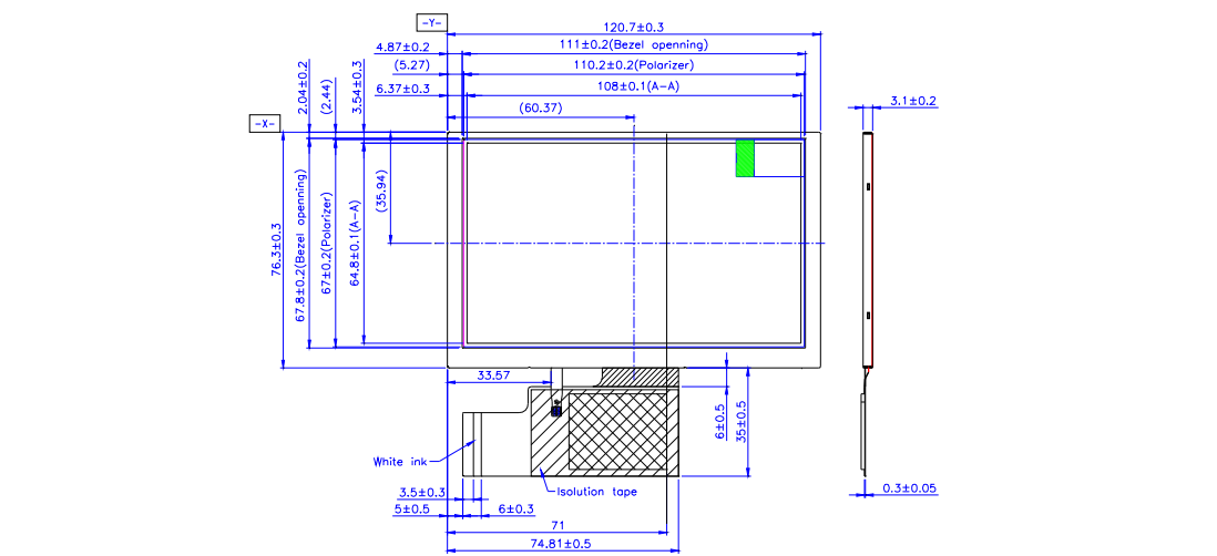 | 外观尺寸 | 120.7(横)×76.3(竖) ×3.3(厚) mm | 可视尺寸 | 111.25(横)×68.7(竖) mm |