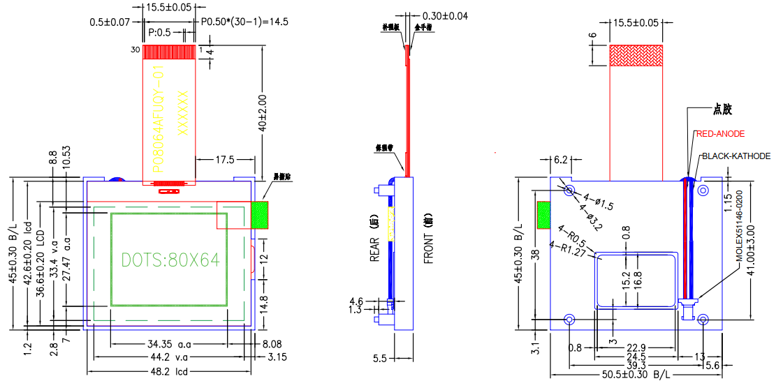 WYM8064K2G COG 单色点阵屏采用 FSTN 显示模式与 ST7565R 驱动芯片,搭配 SPI/MCU 双接口设计,兼容主流工控设备驱动逻辑;产品采用 FPC 插接 / 焊接连接方式,30Pin 金手指接口,安装便捷、连接稳固,可满足不同设备的集成需求。
