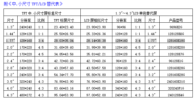 以上是小编整理出来可以单色屏替代TFT液晶屏的尺寸表,有需要的可以咨询南京罗姆官网客服!